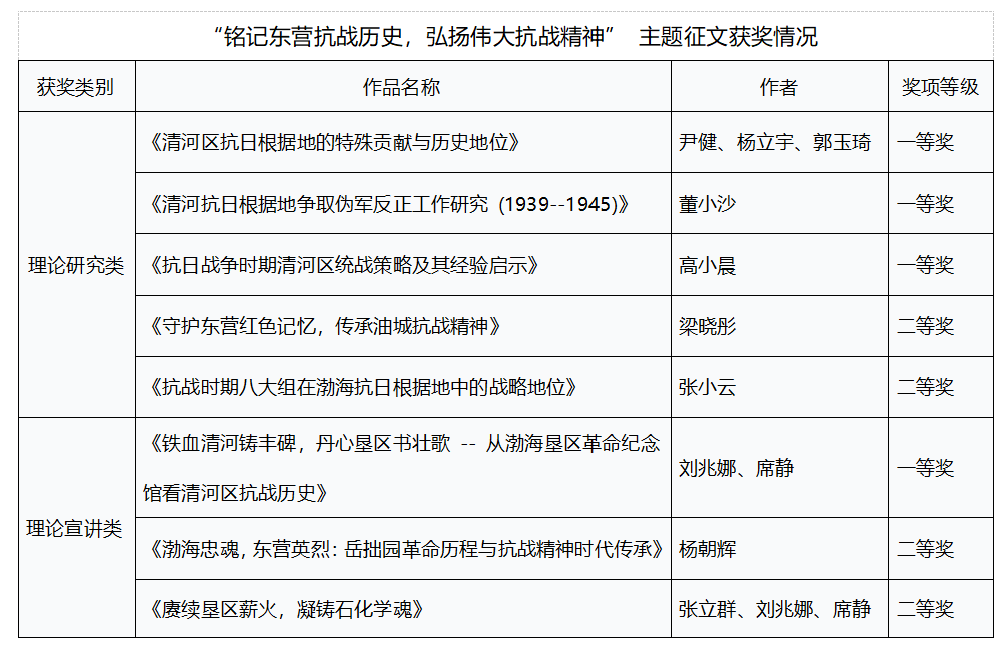 近日,东营市社会科学界联合会发布 “铭记东营抗战历史,弘扬伟大抗战精神” 主题征文获奖情况,我院教师积极参与并斩获多项荣誉。