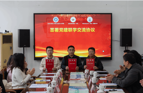 揭牌仪式后,山东石油化工学院马克思主义学院思政第二党支部、东营胜利一中第四党支部、中国石油大学(华东)附属中学党支部共同签订了党建联学交流协议。三方约定将建立常态化联学机制,共享优质党建资源,联合开展主题党日活动,切实将党的组织优势转化为推动思政课改革发展的强大动力,以高质量党建引领一体化建设走深走实。