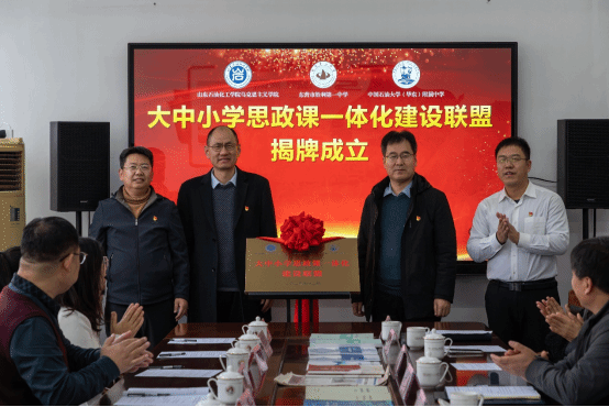 大中小学思政课一体化建设是落实立德树人根本任务、深化新时代学校思想政治理论课改革创新的关键举措。2025年12月16日下午,由山东石油化工学院马克思主义学院牵头,东营胜利第一中学、中国石油大学(华东)附属中学共同发起的“大中小学思政课一体化建设联盟”揭牌仪式隆重举行。联盟的成立,旨在凝聚三方合力,探索大中小学思政课一体化建设的实现路径,共同提升思政教育的质量与效果,促进区域思政教育协同发展。